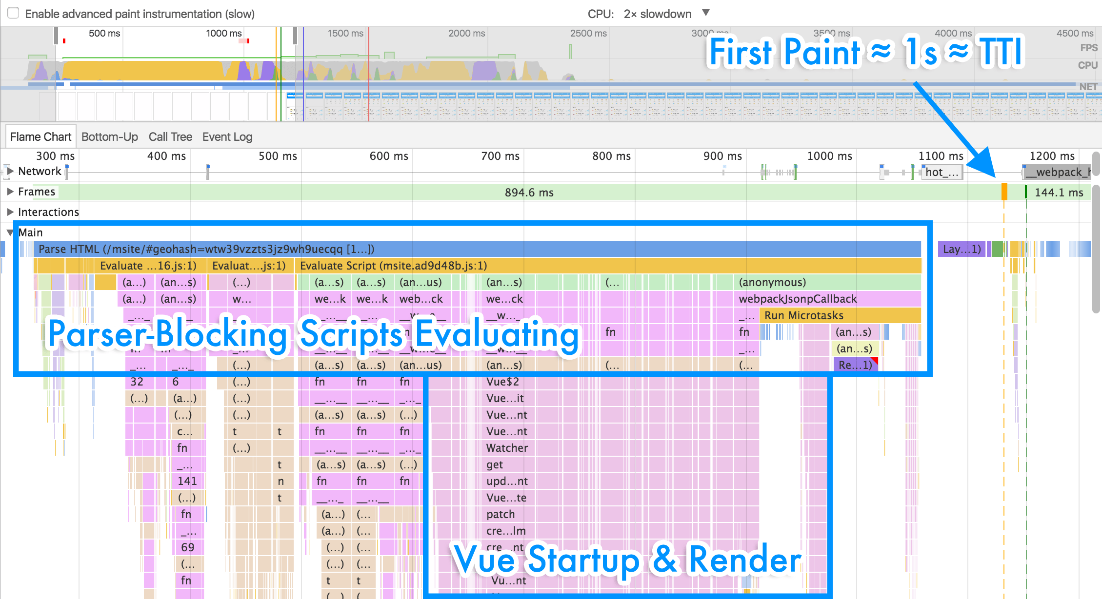 根据 Profile,我们发现在首次渲染(First Paint)发生之前,大量的时间(900 毫秒)都消耗在了 JavaScript 的运行上(Evaluate Script)。几乎所有脚本都是阻塞的(Parser-blocking),不过因为所有的 UI 都是由 JavaScript/Vue 驱动的,倒也不会有性能影响。这 900ms 中,约一半是消耗在包括 Vue 运行时、组件、库等依赖的运行上,而另一半则花在了业务组件实例化时 Vue 的启动与渲染上。从软件工程角度来说,我们需要这些抽象,所以这里并不是想责怪 JavaScript 或是 Vue 所带来的开销。