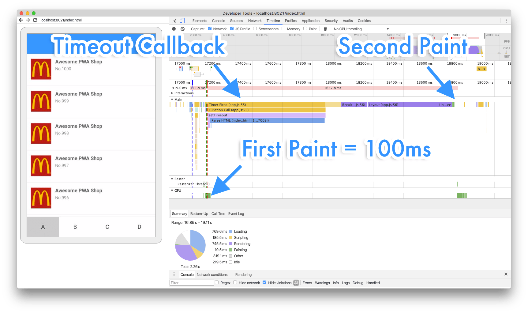当当!首次渲染瞬间就被提前了。如果你熟悉浏览器的事件循环模型(event loop)的话,这招 Hack 其实是通过 setTimeout 的回调把 DOM 操作放到了事件循环的任务队列中以避免它在当前循环执行,这样浏览器就得以在主线程空闲时喘息一下(更新一下渲染)了。如果你想亲手试试 MMPWA 的话,你可以访问 github.com/Huxpro/mmpwa 或 huangxuan.me/mmpwa/ 访问代码与 Demo。我把 UI 设计为了 A/B Test 的形式并改为渲染 5000 个列表项来让效果更夸张一些。